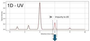 - Use Heartcut-2DLC-MS. This technique allows to analyze the sample with the original QC method, then isolate the unknown UV peak of interest and inject it onto a second-dimension Liquid Chromatography (LC) column with MS-compatible mobile phases. Coupling the latter to a high-end MS detector enables mass spectrometric identification of the impurity.